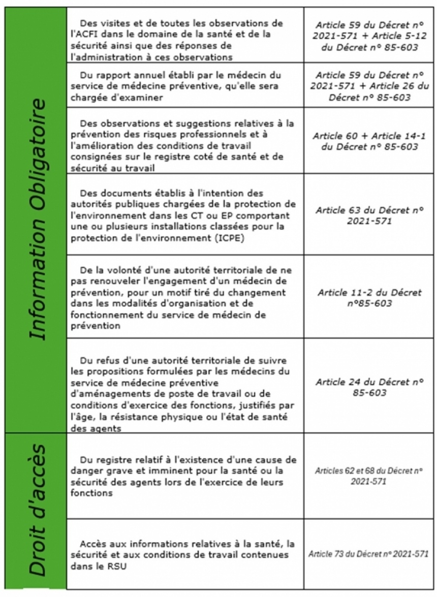 - Règlements et consignes en matière d'hygiène de sécurité et de conditions de travail (article 58 du décret numéro 2021- 571 du 10 mai 2021 relatif aux comités sociaux territoriaux des collectivités territoriales et de leurs établissements publics)