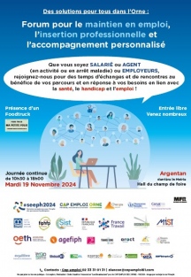 Dans le cadre de la SEEPH 2024 (Semaine Européenne pour l’Emploi des Personnes Handicapées), le Cap Emploi 61, et ses partenaires acteurs de la prévention de la désinsertion professionnelle, organisent un forum départemental afin de réunir les acteurs du territoire au bénéfice des SALARIES / AGENTS et EMPLOYEURS de l'Orne :