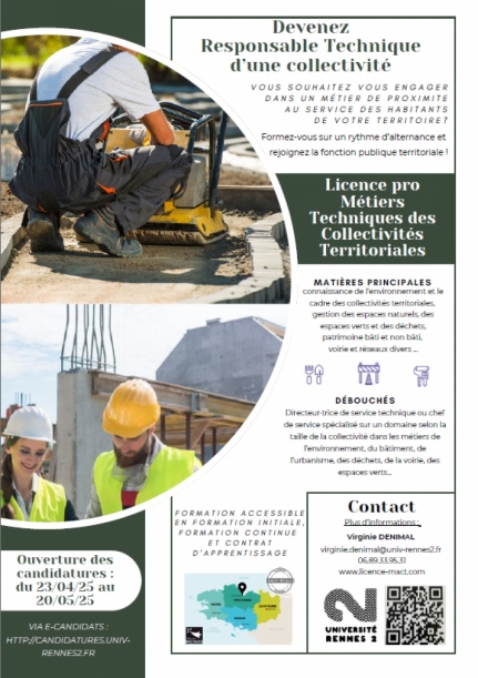 Afin de répondre au mieux aux besoins des collectivités en termes de recrutements de personnels, l'Université de Rennes 2 propose depuis 12 ans, une licence professionnelle qui forme de futurs responsables de services techniques ou des futurs directeurs de services techniques en fonction des expériences acquises.